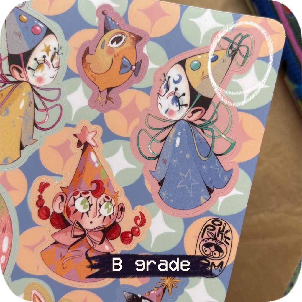 ✿ B-grade samolepky mají drobnou vadu – v tomto případě je více samolepek vyřezané mírně mimo střed, takže ořezová linka může téměř zasahovat do ilustrace či je viditelně nerovnoměrně ve středu. Ostatní jsou však bez vady, a tak jim můžete ve slevněné verzi dát šanci na nový domov.